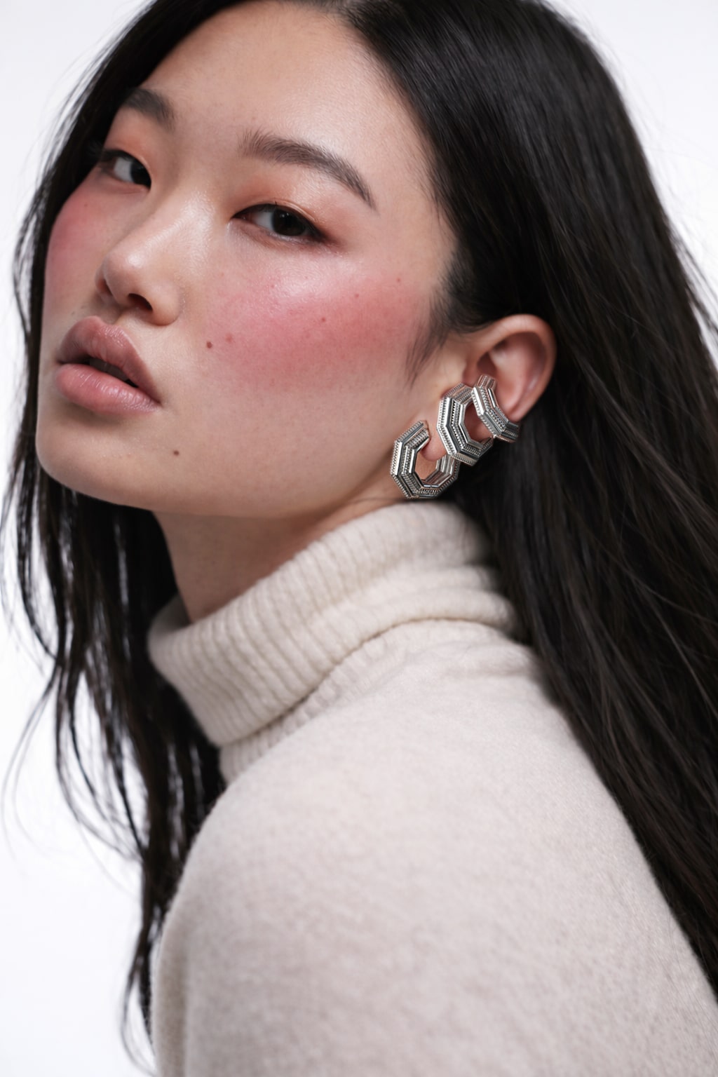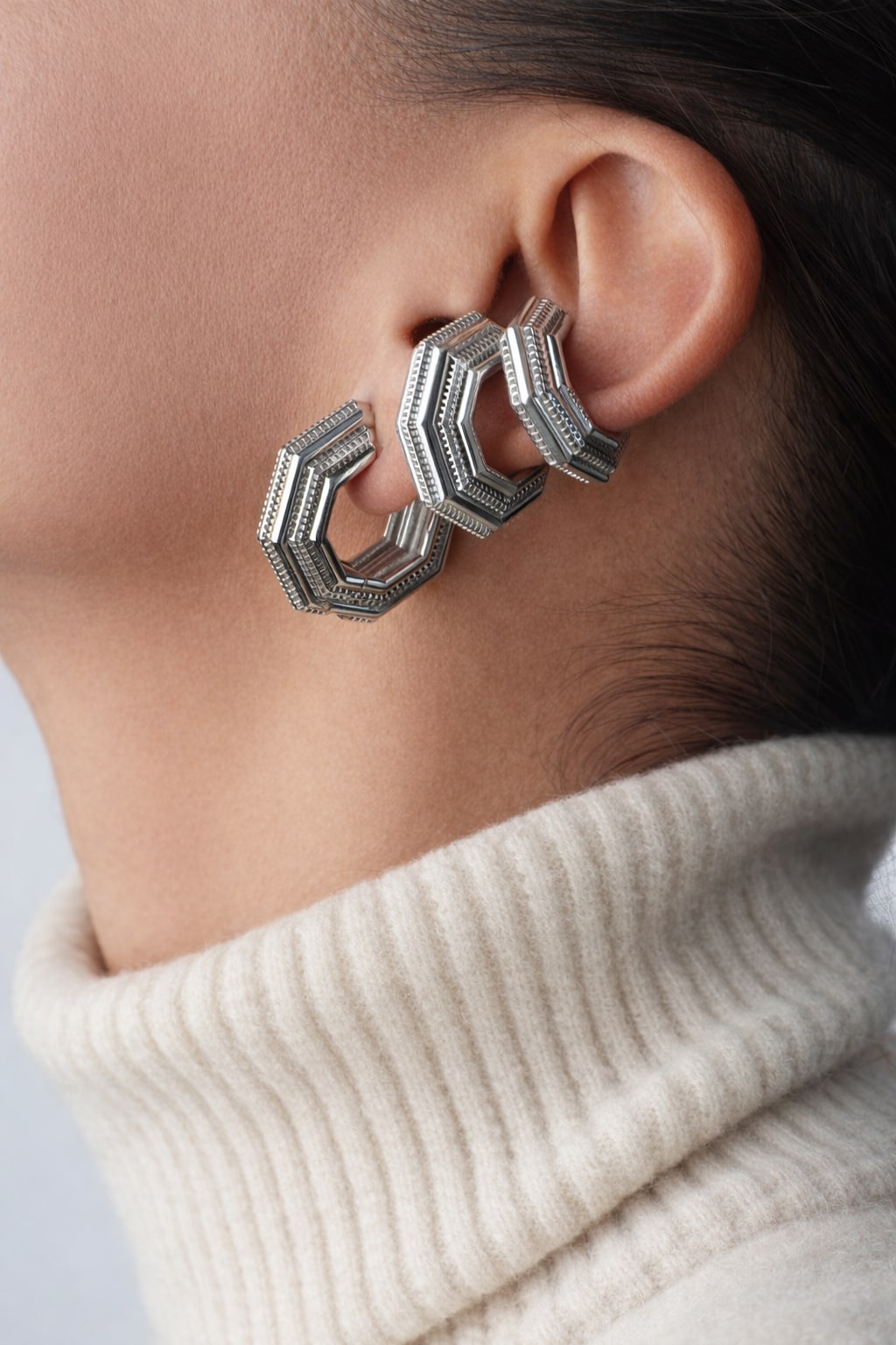 A symbol of boldness: The Octavia Earring turns heads with its striking geometric form. Its mirror-like rhodium finish highlights a powerful, modern presence pushing the limits of style with confidence. Blending the strength of minimalism with bold lines, Octavia radiates a sophisticated yet fearless energy. Lightweight and easy to wear, it lets you move freely all day long.