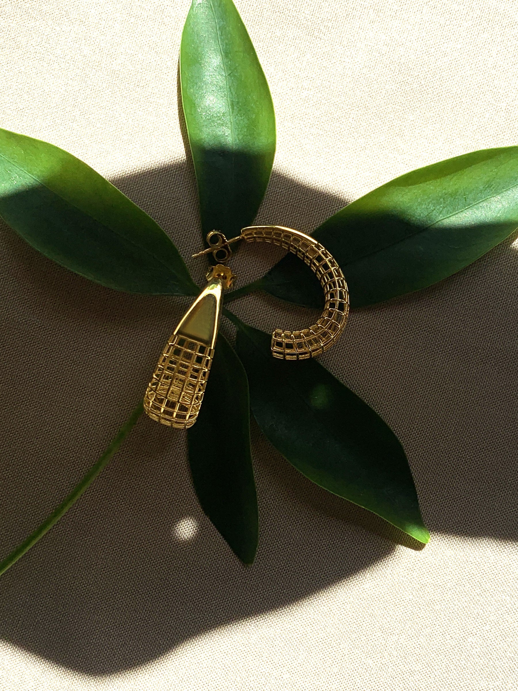 Klasik damla formuna modern bir yorum katan bu tasarım, incelikle işlenmiş dokusu ve asimetrik yapısıyla dikkat çeker. Telli formu sayesinde ışığı farklı açılardan yakalayarak göz alıcı bir parlaklık yaratır. Her hareketinizde ışığı yansıtan yapısıyla karakteristik bir duruş sergileyen bu tasarım, mücevher kutunuzun öne çıkan parçalarından biri olacak.